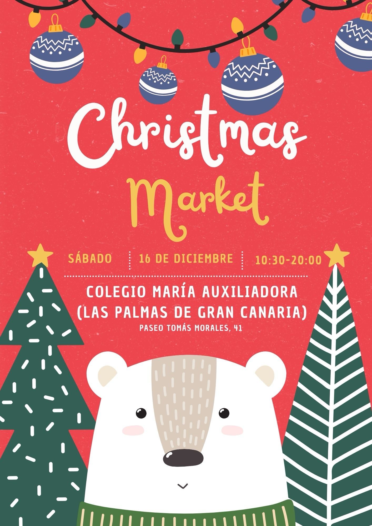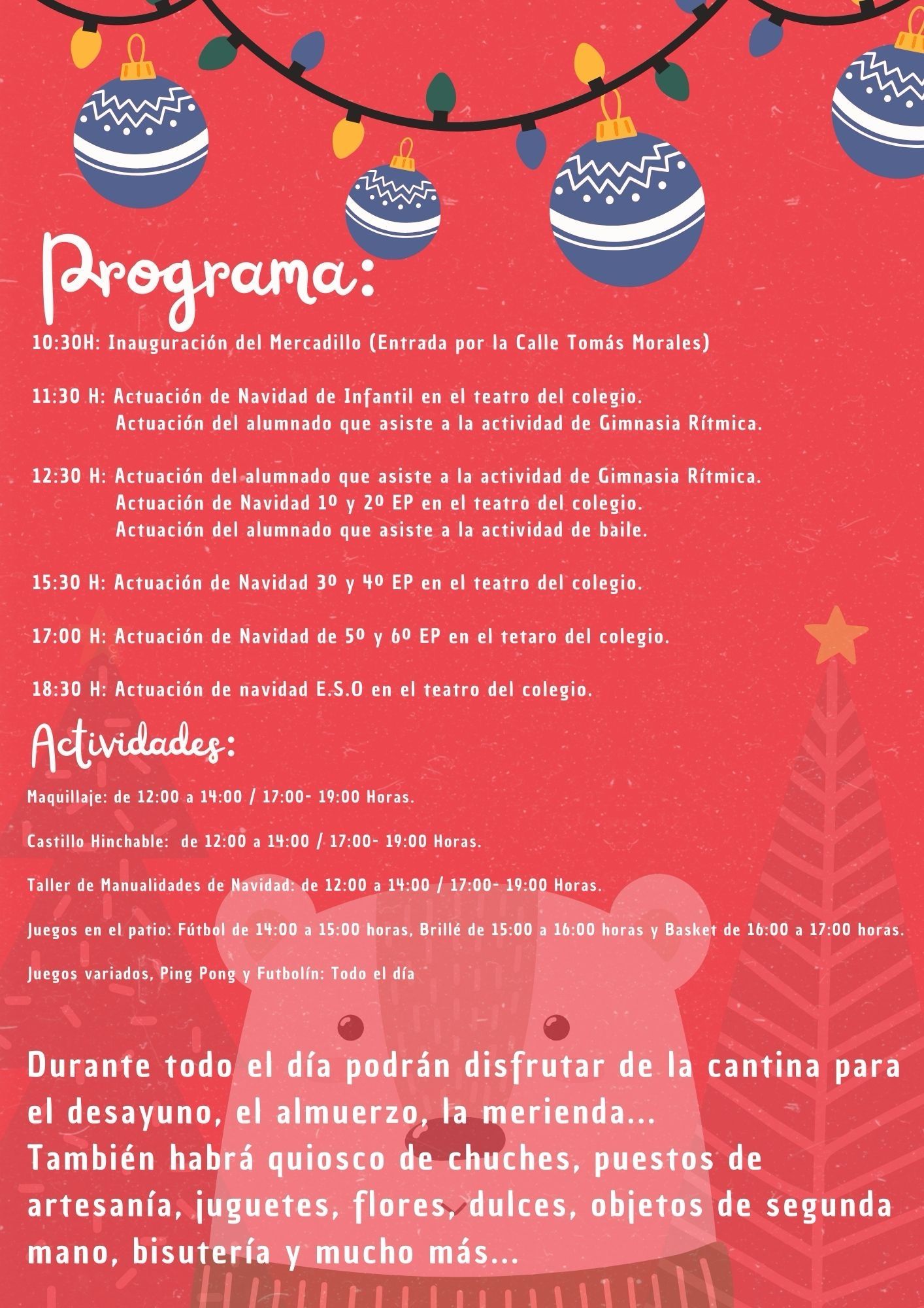 Un año más, El Colegio María Auxiliadora les invita a todos a pasar un día en familia, divertido y lleno de Espíritu Navideño en nuestro Mercadillo de Navidad el próximo sábado 16 de Diciembre. A continuación les mostramos el programa de nuestro Mercadillo, ya que habrá muchas sorpresas que no pueden perderse, incluidos nuestros tradicionales Villancicos.